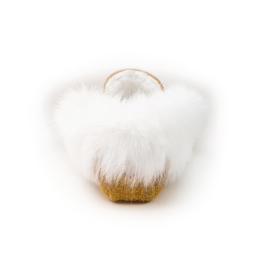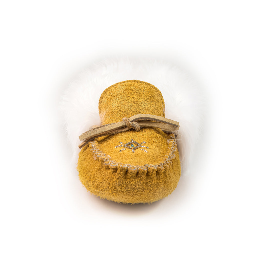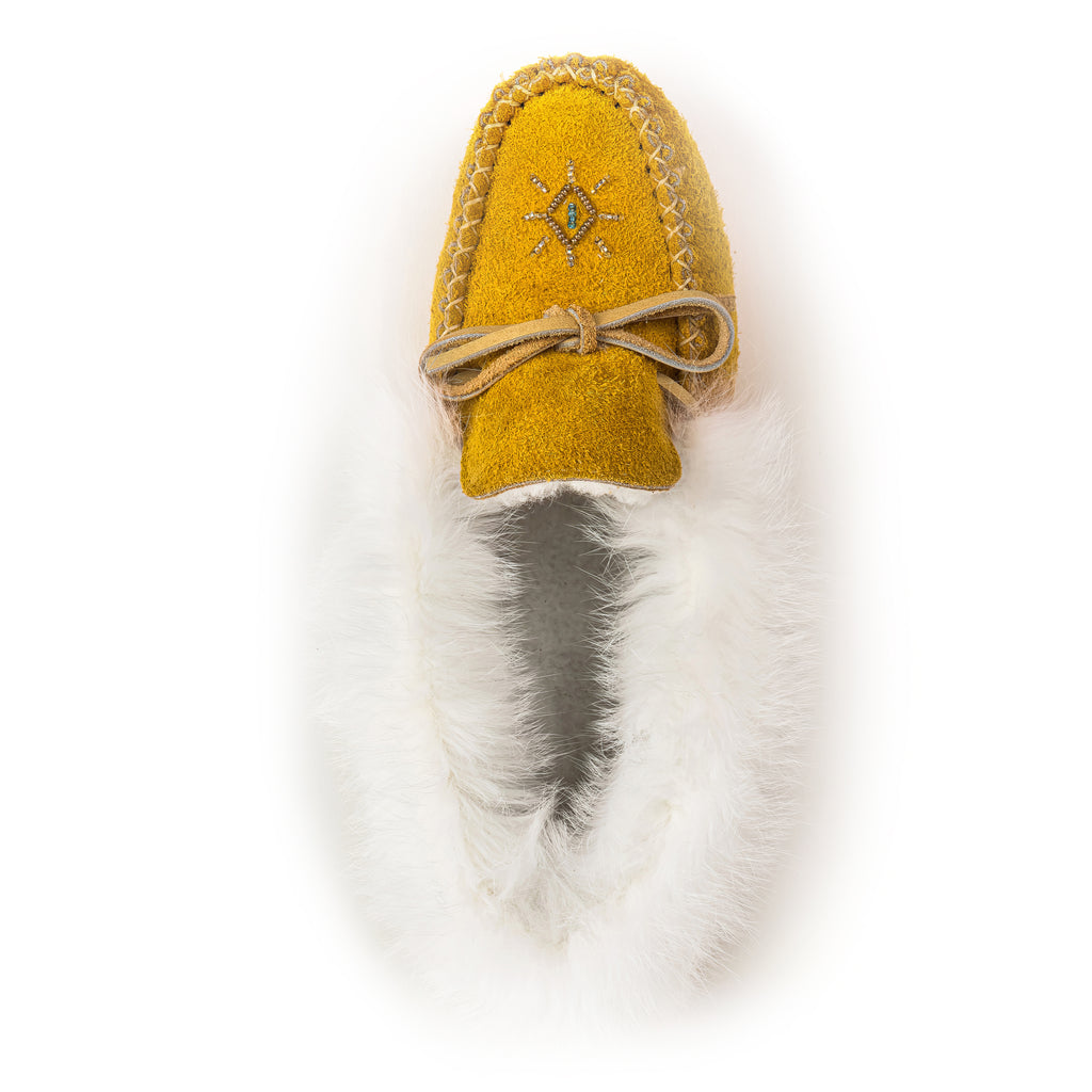 Dorlotez vos pieds avec le AOSKWAY. Fait de suède d'orignal et de fourrure de lapin, ce mocassin d’intérieur perlé à la main tiendra vos pieds au chaud à coup sûr.