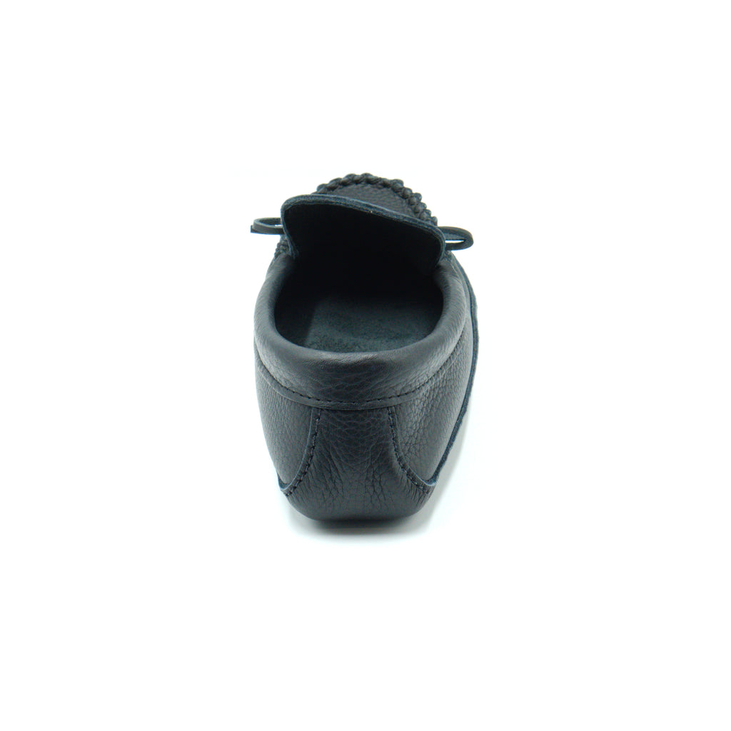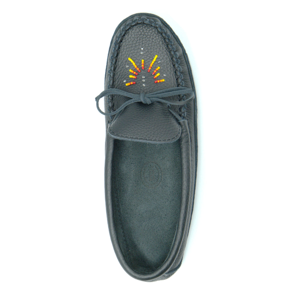Inspiré de la signification du nom Taourenche (soleil levant), le design de l’artiste Alexane Picard représente un levé de soleil. Les couleurs chaudes comme le rouge et de jaune crée un vif contraste sur le cuir noir du mocassin. Chose certaine, le modèle Taourenche ne passe pas inaperçu!