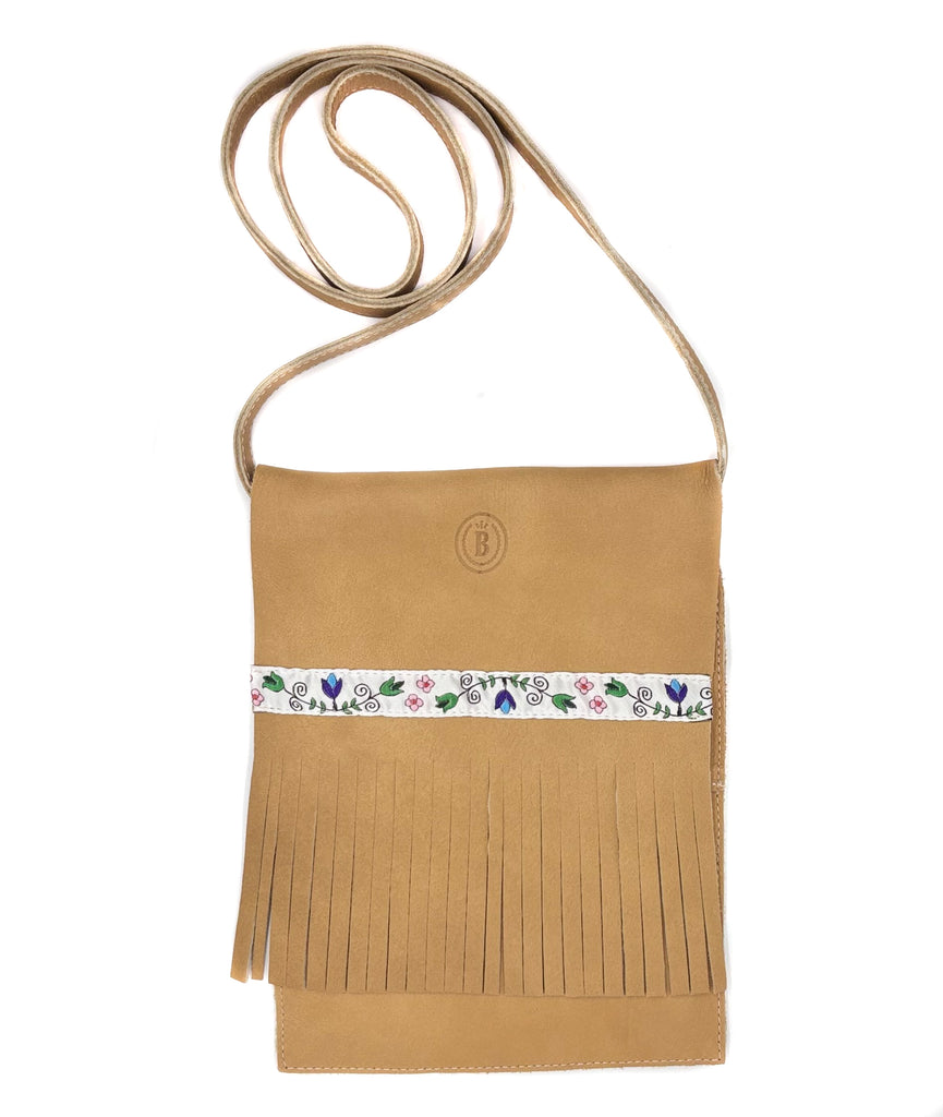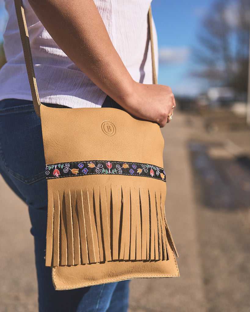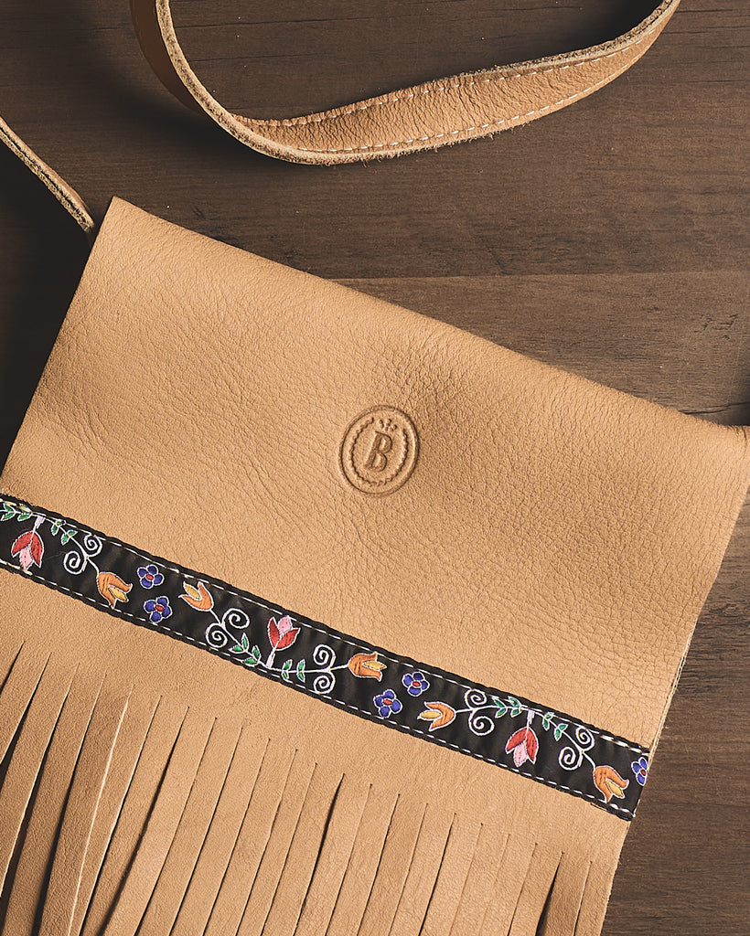 Notre sacoche en bandoulière en cuir d’orignal allie tradition et mouvement. Sënrawah signifie « danse » en Wendat. Avec ses franges élégantes et sa bande de tissu fleuri, Sënrawah accompagne chaque pas avec fluidité et caractère. Un hommage au à l’énergie du mouvement. Format : 11" de hauteur par 9" de largeur.